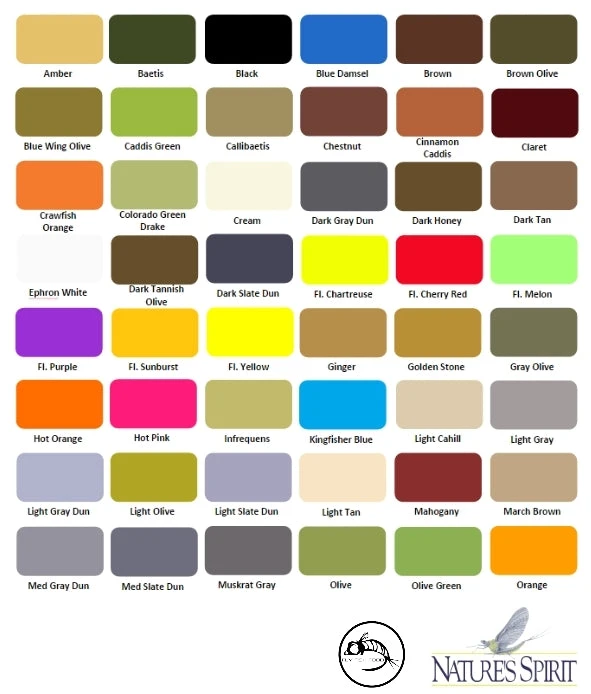 | Color | Brown, Brown Olive, BWO, Callibaetis, Claret, Crawfish Orange, Dark Brown, Dark Olive, Fl. Chartreuse, Fl. Melon, Fl. Cherry Red, Fl. Purple, Fl. Orange, Fl. Sunburst, Gray Olive, Fl. Yellow, Muskrat Gray, Olive, Orange, Tan, Mahogany, White, Yellow, Black, Pale Olive, Pale Yellow, Fl. Hot Pink, PMD, Rusty Spinner, Sulphur Orange, Light Olive, Red |