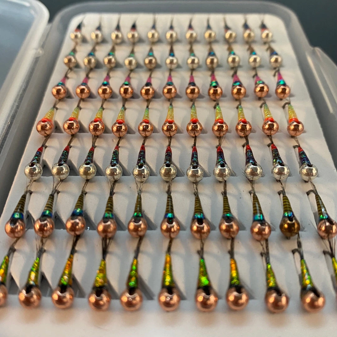 Each box comes with a solid 70 flies in 7 unique patterns. Great for anchor flies, or to use as a dropper under your favorite dry. A pocket sized (3×4 1/2″) Fly Fish Food logo fly box is included. Flies are all barbless jig hooks sized #16 or #14 . The larger flies come with a 3.5mm bead to get your flies down to the bottom quickly and into the strike zone. Whether you’re new to Euro nymphing looking for a starter set of flies, or a veteran needing a quick refill before hitting the water, this fly assortment was made with you in mind.