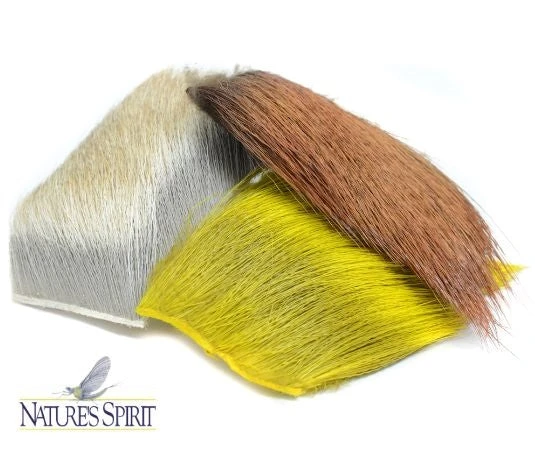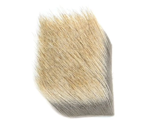 This is the flank hair off the bull elk. The color varies from light ginger to creamy blonde (rarely almost white) with dark tips. This bull elk hair is great for tying winged patterns where you don’t want a lot of flaring.