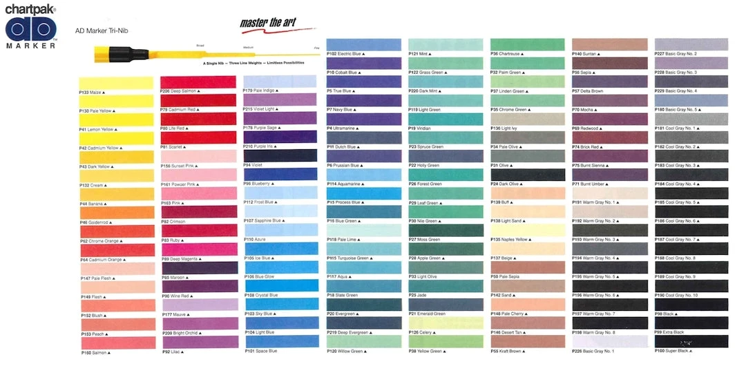 | Marker Colors | Black, Burnt Sienna (Rust), Cadmium Orange, Celery (Olive), Chartreuse, Chrome Orange, Dark Olive, Delta Brown (Dark Brown), Desert Tan (Dark Tan), Goldenrod, Gray, Olive, Pale Olive, Pale Yellow, Sand (Tan), Sepia (Med. Brown), True Blue |