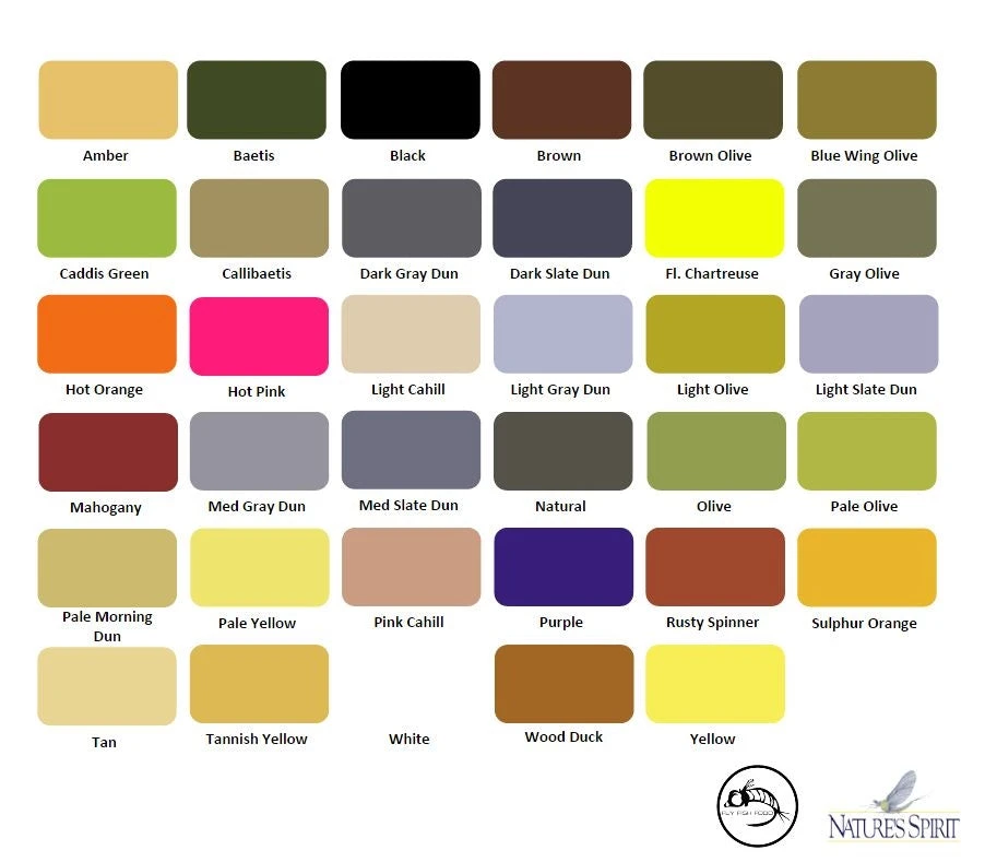 | Color | Amber, Baetis, Brown, Brown Olive, BWO, Callibaetis, Dark Dun, Fl. Chartreuse, Gray Olive, Hot Orange, Hot Pink, Light Cahill, Light Gray Dun, Light Olive, Medium Gray Dun, Natural Mallard, Olive, Pale Yellow, PMD, Rusty Spinner, Tan, White, Wood Duck, Black |
