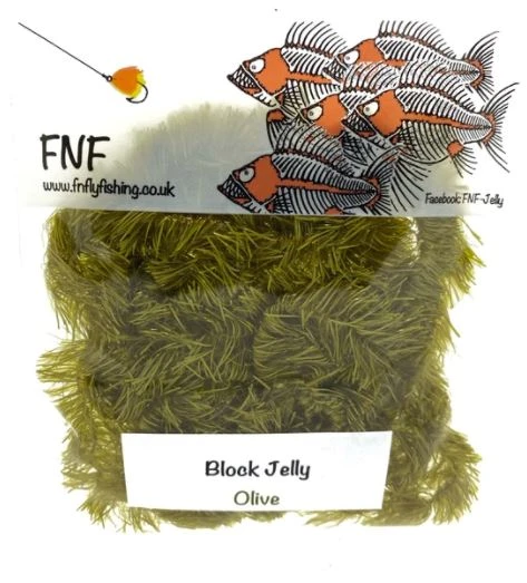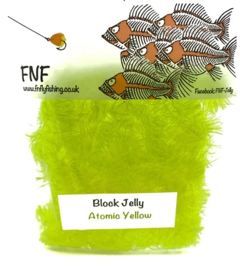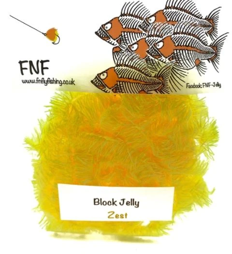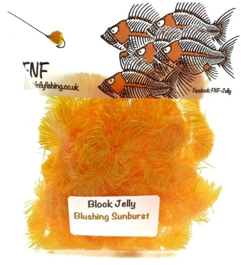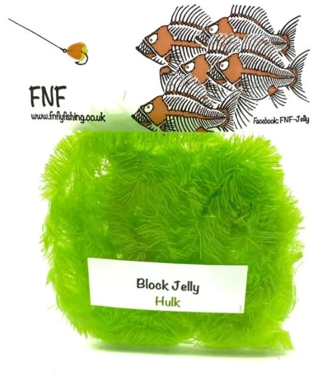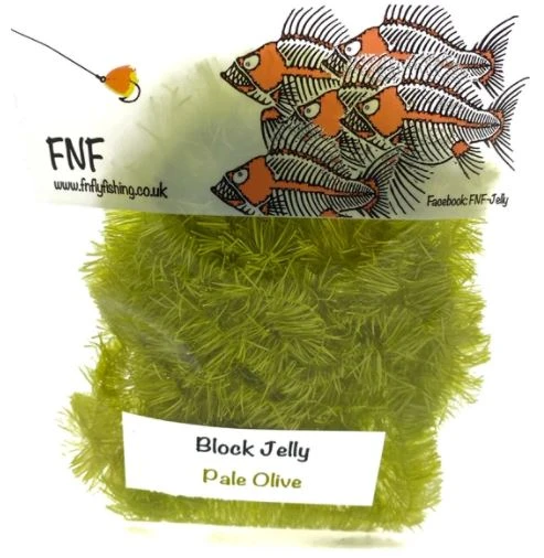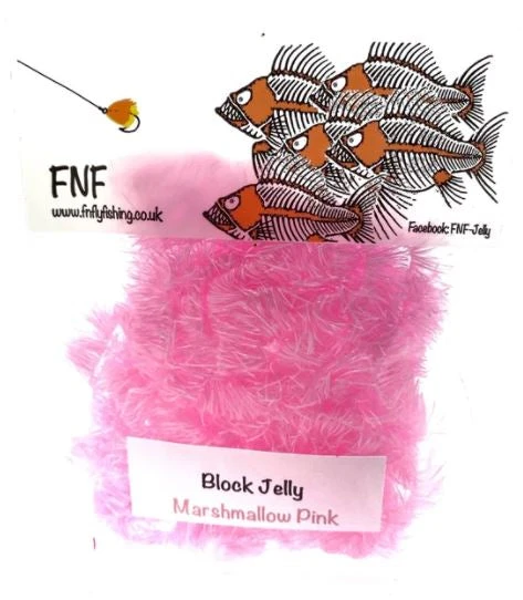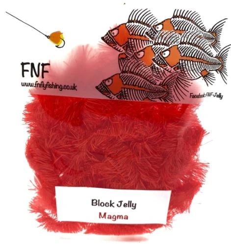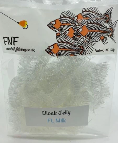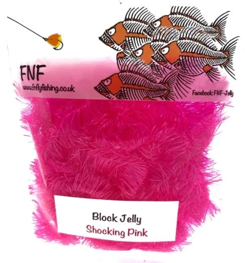 Block Jelly is a blend of opaque and jelly fibers. The opaque fibre has been designed to reflect fluorescence light from the tips and edges of the jelly fiber while creating a block color in the water. Very importantly the fibers like its sister jelly fritz have been cut and compressed as small as technically possible. Very importantly this is an un-boosted fritz allowing it to flair open in the water while static and close fibers when pulled, giving the pattern lots of movement.