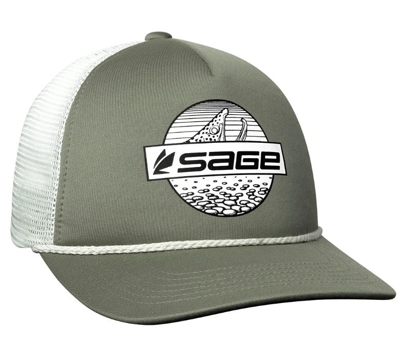 Sage foam trucker hat with sage black and white sage logo on an olive hat