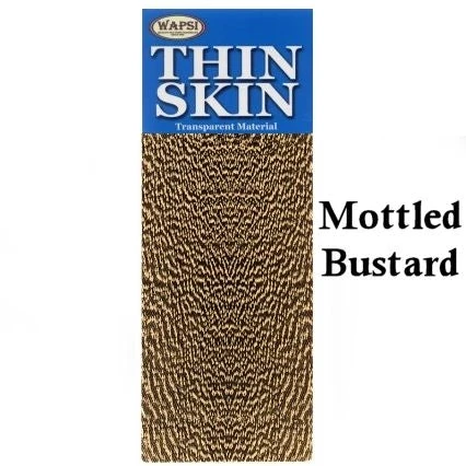 Thin Skin is a .004″ thick, stretchable and transparent sheet material that has a matte finish on one side and a shiny finish on the other. It is backed with a paper backing which makes it easy to cut into strips of all sizes. When the paper is removed, the transparent sheet can easily be tied onto the fly.The printed patterns on our Thin Skin can create an extremely realistic and/or dramatic look to the fly. Because Thin Skin stretches and compresses when thread or wire is wrapped around it, it is an ideal material to use for shellbacks on flies such as scuds or sowbugs or for wing cases on nymphs of all types. Many bass and saltwater fly tyers often use it to tie segmented crayfish and shrimp patterns.